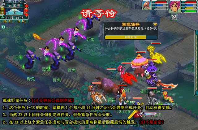 小技巧〔孤魂野鬼〕∶〔14分钟后会强制完成〕 1、这个任务1-2X的时候,就算你1个都不刷14分钟之后也会强制完成任务,自动获得奖励。 2、当然3X以上同样会强制完成任务,但是紧急任务会失败。 2、在3X以上这个紧急任务成功与否会极大的影响你最后隐藏剧情的触发〔但不是必定〕 。