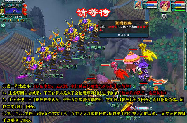 小技巧〔阵法战斗〕∶〔队伍中如有无底洞,主怪喊话只要煞气决保护十分简单〕 1、主怪每回合会喊话,下回合前排龙太子会使用烟雨剑法进行点杀〔被点杀的队员一定要防御〕 2、主怪会使用日月乾坤控制队员,但千万别浪费愤怒解封,它的日月乾坤只封2回合,而且他是龟速。所以其实只封1回合。 3、第5回合,主怪会召唤5个龙太子和2个神天兵造型的怪物,所以第4回合被点名的队员,一定要及时防御,千万别掉以轻心 。