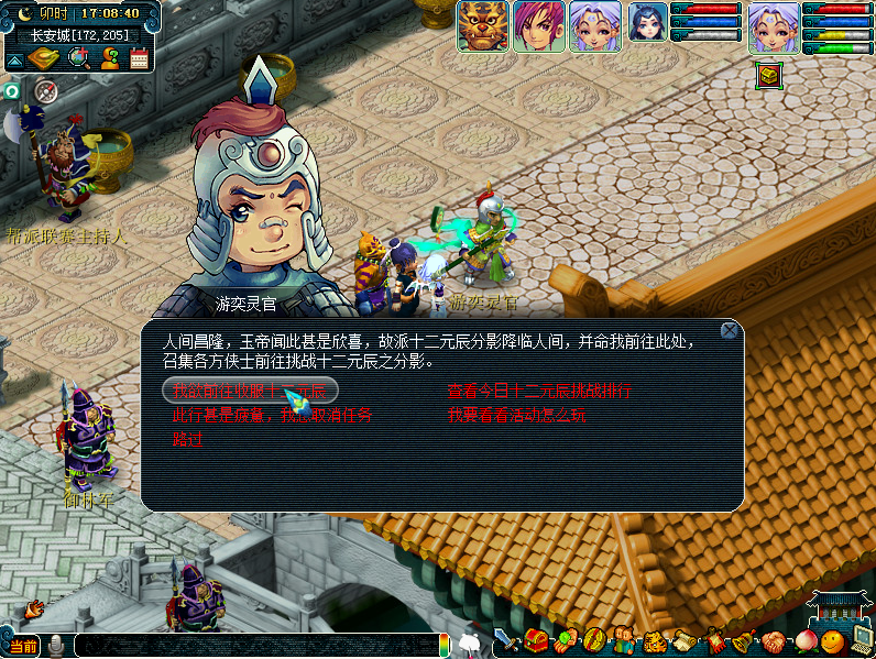 每周一~每周四20:00~22:00期间,等级≥30级的玩家可以组队前往长安城(174,207)处,找到游奕灵官领取十二元辰任务。领取任务后,根据任务提示前往各地找到十二元辰分影挑战即可。