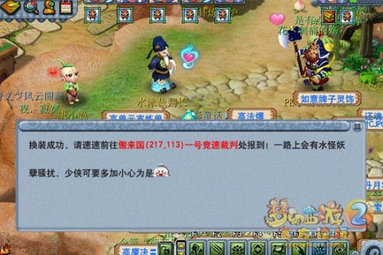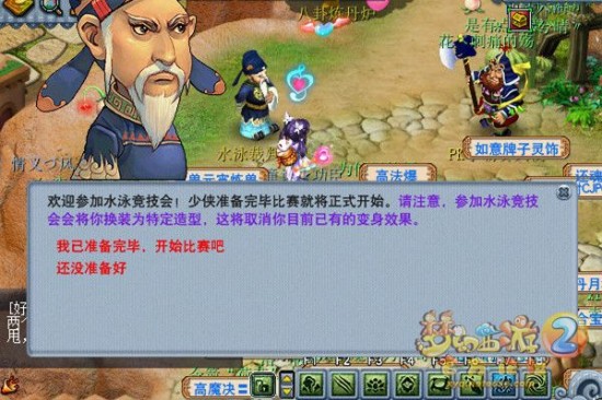【活动介绍】:酷暑时分,去江河湖海畅游一番,才是最爽快的解暑方式!时值盛夏,唐王 特举办水泳竞技会,以让三界众生切磋游泳技艺,共渡清凉一夏。等级≥30级,≥3人的队伍可以在活动时间内前往傲来国(111,109)水泳裁判长处参 与。预赛为活动期间每周一至周六12:00-16:00,18:00-22:00,决赛为周日晚18:00-20:00。竞速赛中,玩家将会在途中遭遇暗 雷怪物的挑战,如果挑战失败,需要报到的裁判编号将倒退至之前的裁判。最终以到达十五号 竞速裁判处所花费的总时间来排定名次。每周一至周六为预赛阶段,预赛中获得过前十名的玩家都可以参加周日18:00举行的决赛。