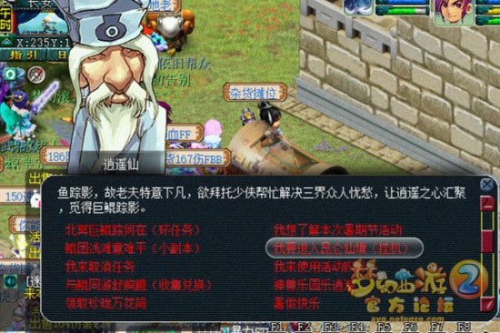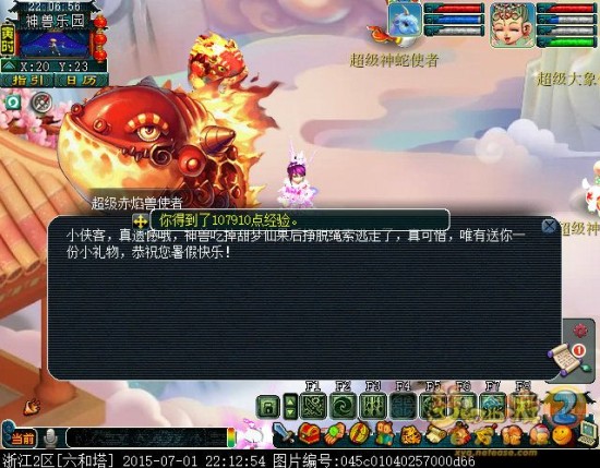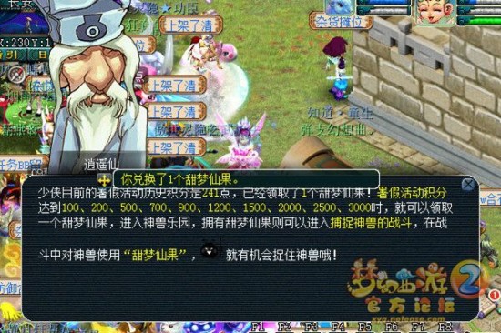 【玩法介绍】:逍遥游仙卷记载的南海仙岛上,无忧树结有甜梦仙果,是神兽们最爱吃的果子,少侠们齐心协力发现了仙岛踪迹,逍遥仙也得以采集到一些甜梦仙 果,当少侠获得的暑假活动积分达到100、200、500、700、900、1200、1500、2000、2500、3000时,即可找长安城 (230,120)处的逍遥仙领取神兽们最爱吃的“甜梦仙果”,进入神兽乐园,拥有甜梦仙果则可以进入捕捉神兽们的战斗,在战斗中对神兽们使用“甜梦仙 果”,就有机会捉住他们哦!