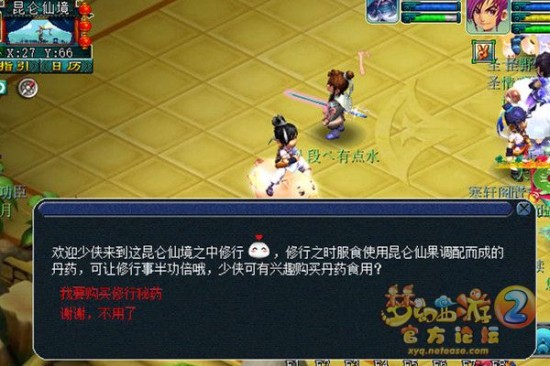 【玩法介绍】:昆仑仙境乃是一处修炼的洞天福地,欢迎各位少侠前往修行!≥10级的玩家可以进入修行,每3分钟获得一次经验奖励,每日最多可获得100次奖励。各位少侠可从长安城(230,120)逍遥仙处进入昆仑仙境。