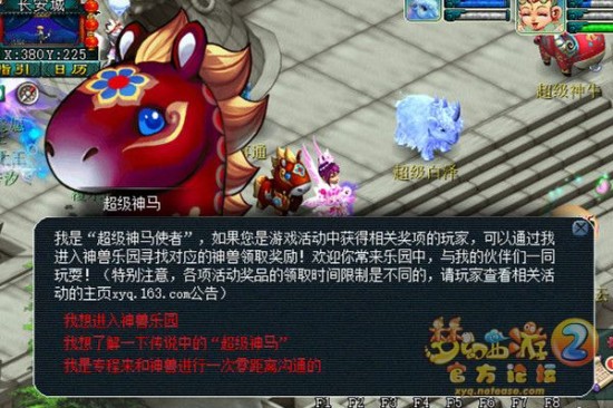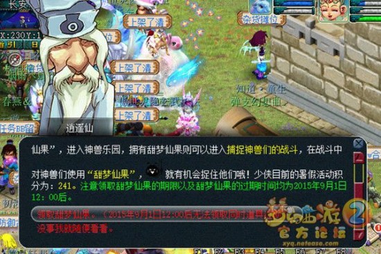 当活动积分达到100、200、500、700、900、1200、1500、2000、2500、3000时,即可找长安城(230,120)处的逍遥仙领取神兽们最爱吃的“甜梦仙果”,进入神兽乐园,捉神兽哟。