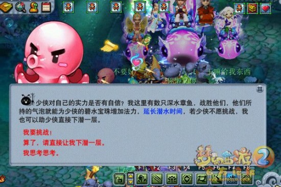 深 潜是另一种游泳形式,类似于暑假的爬塔活动,不过相对来说简单些。每一层有可能直接传送至下一层,有可能会出现一些任务,第一种是答题,题目都比较简单。 第二种是抛骰子比大小,这边如你抛到了4点,怪抛到了3点,那么它就降低一点气血。只要比它抛出来的数字高3就可以了。第三种是大家说熟悉的选择正确的链 子,这个还是比较简单的啦。第四种任务是战斗类,战斗不难,程度和竞速怪的难度差不多。根据小伙伴们提供的数据,深潜到40层以后才会有奖励哟。