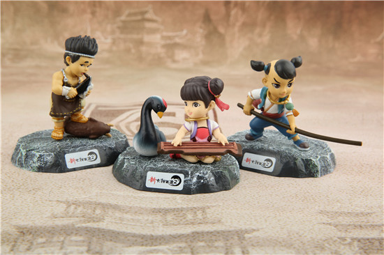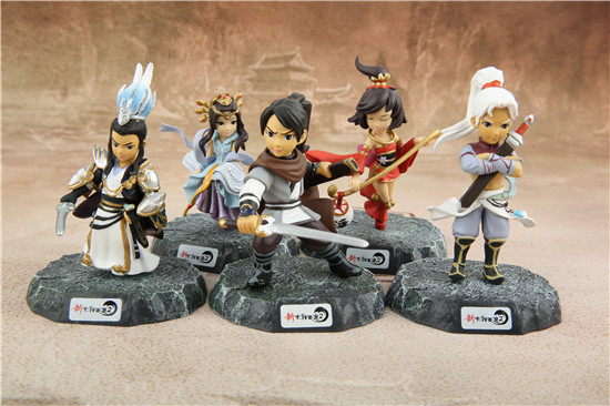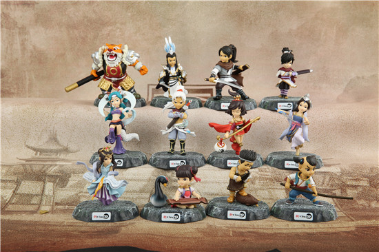 首先看到的是大话2精美的角色手办,这些手办角色为养育宝宝(男)、养育宝宝(女)、飞剑侠、媚灵狐、剑侠客(2种造型)、肉贩子、虎头怪、玄剑娥、夜溪灵、倾国女神、革命领袖12个中的随机一个。