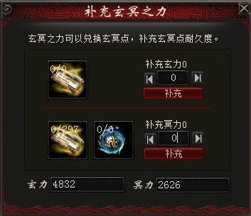 玄圣秘法:右键点击直接弹出补充玄冥之力界面,每个道具补充20玄力,雁塔250积分、孤竹城250积分、地宫150积分一个,1转以上可兑换,每日可兑换1个,每杀过一关困难关当日可多兑换2个;完成15000熟练度功绩也可以获得