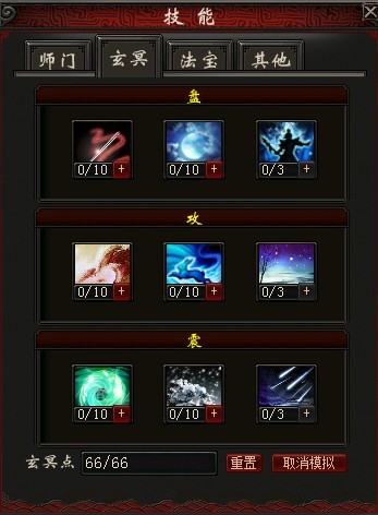 玄冥点最多可兑换66个,可通过模拟加点来预览属性,分配好技能点后不可随意洗点,需要点击洗点按钮消耗金钱/通宝进行洗点