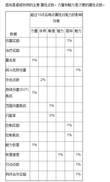 虔诚牧师的主属性是感知,它直接影响到你的治疗量,主加。初始人物roll属性点时,至少保持18以上。