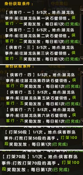 再来说说老江湖和武林宗师的任务。由于2个任务链差不多,在此便不分开赘述了。这2个任务链就算你身份没开也是可以提前跟天涯浪子的任务一起做的。6个石壁都是1天cd每天只能做一次算上天涯浪子的取水任务,如果每天做阅历够的话5天就能拿到这件衣服。