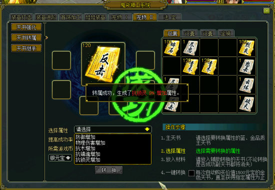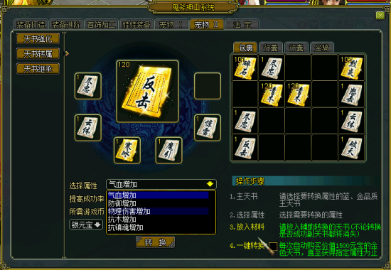 打开操作界面,放入需要操作的主天书,选择需要转换的属性;