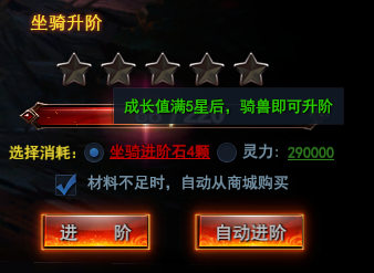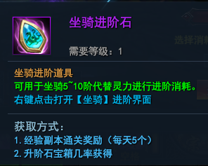 由于灵力在游戏中比较珍贵,强化装备、各系统升阶都有需求,所以4-5开始坐骑进阶石可以代替灵力进行消耗,升阶可以选择消耗进阶石或者灵力,