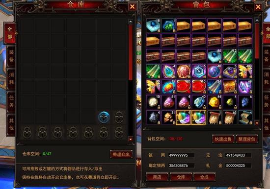 仓库可用于承载玩家不常有的道具和装备,也可以将物品取出放入自身背包内。