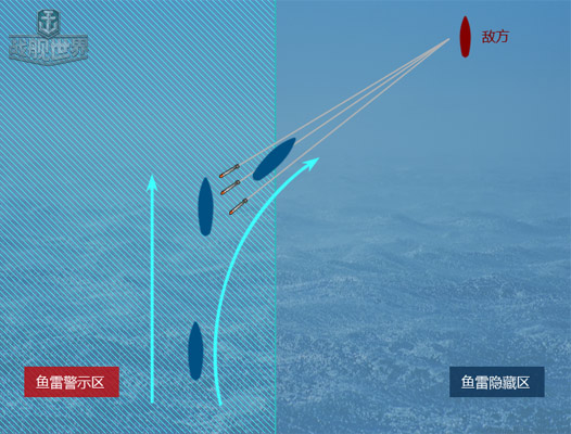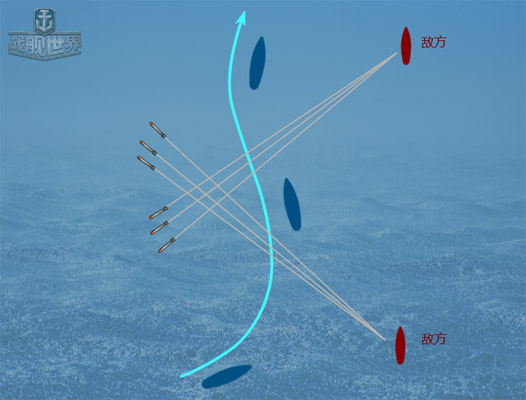 不规则运动躲避:下图情况在开阔的海域会经常遇到,中长距离鱼雷攻击满街跑,而这种时候你也很可能早已加入战局,从而没有太多的心思去关注鱼雷,所以这种时候要在保证自己 安全及航路的情况下多做不规则运动,因为鱼雷的预判机制是按照你直线航行所定的,当你进行大迂回或者不规则运动后,可以有效的规避这些长距离的鱼雷攻势!