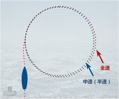2.速度的影响:二战时期的船只没有主动横向推力装置,也就是说,要转弯,只能靠舵,或者是螺旋桨。桨的推力完全取决于移动的水流。首先,舵面积,舵的位置,船的形体和结构这些参数都会影响回转直径,换句话说,一条船做了180度的转弯,其转弯直径和初始航向有关。