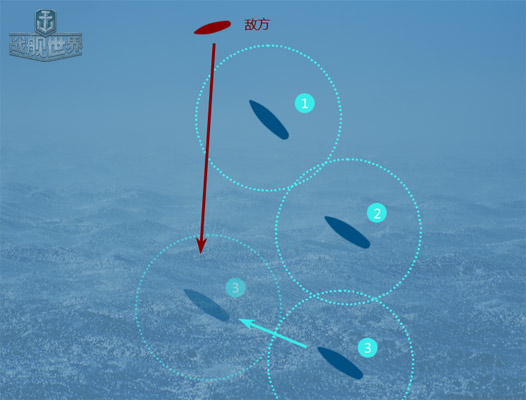 保证预警范围:下图为组成编队的情况,但敌方鱼雷攻击的目标是3号舰时,正常情况下3号舰需要在鱼雷进入了自身的预警范围内才能看到鱼雷水线,但是当你附近有友军的时候,友军会提早的为你提鱼雷预警,这时候当敌方鱼雷经过1号舰的预警范围时,3号舰便可以看到鱼雷了,以便提早作出应对。
