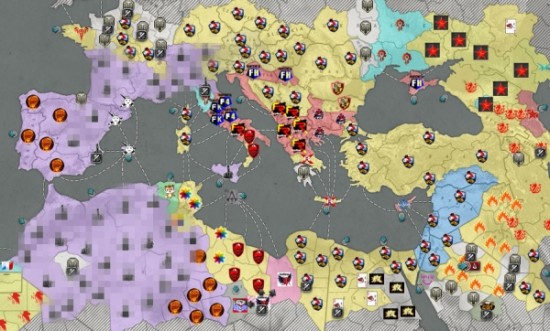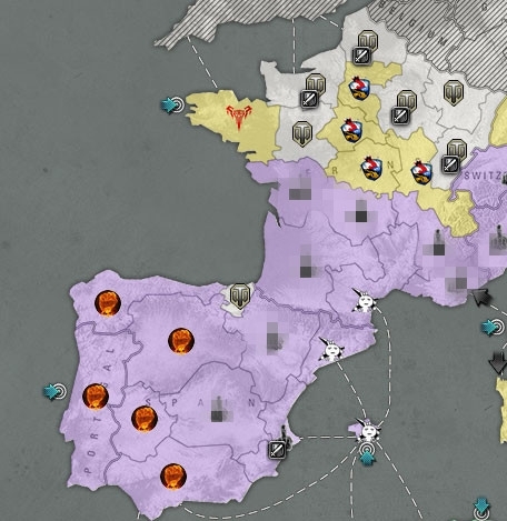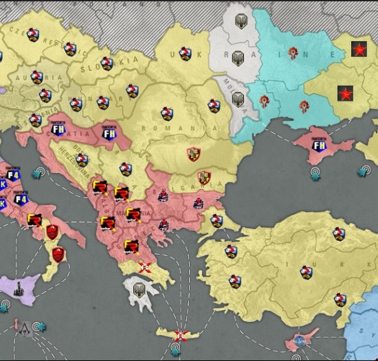 “FH”夺回克罗地亚地区并伴随“FR”对“羽扇纶巾”展开围剿,并逐步取得了一定优势,而“GL HF”则从克里米亚登陆从东面开始进攻,依地图形式可看出,一个三面包围圈已经形成,“黄盟”巴尔干半岛部队如果在得不到强有力支援将面临崩盘的危险。