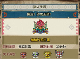 缴纳素材:猎人根据关卡指引,采集所需的素材,缴纳至营地的红色箱子内,即可完成狩猎场。