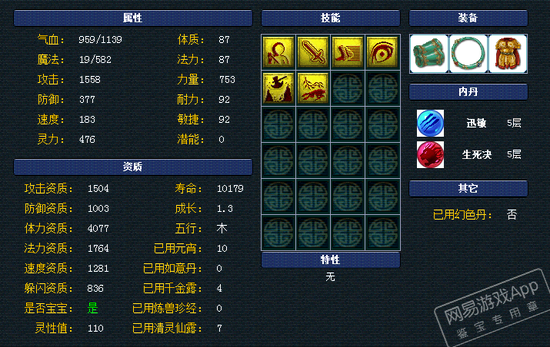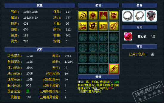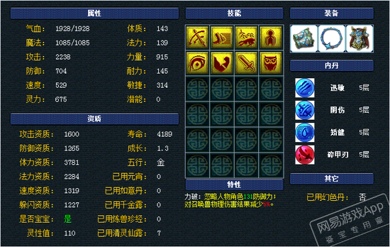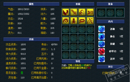 来看8J隐攻魂姐,巅峰的1600攻资,1319速资,1.3成长,110满灵性!魂姐这资质面板亮瞎我了!力敏加点,搭配高敏,魂姐飘逸的身姿把高速隐攻宠的优势发挥到淋漓尽致!高必、高强力让魂姐输出可以瞬间爆炸,同时高感还能克制对面的隐攻。力破特性和碎甲刃,完全瞄准敌人脆弱的部位砍!还要戴个高偷套呀,你能顶的住么?