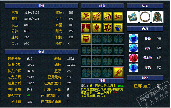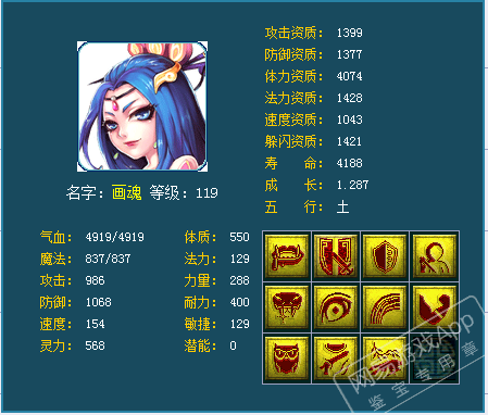 这只是力劈画魂,1502的攻资、4350体资、1.266成长都很出色。9J全红,力体加点,所以攻击不算太高,但是力劈之下,搭配高必,高偷,高强力,对付法系脆皮完全不在话下。高敏也让她的速度得到了提高,增加了先出手的机会。5000+的血量,让她在战场上更加坚挺。内丹也是全满。不过却没带套子,提升空间还是有的,看老板走什么方向咯。建议带高神套,增加一下生存能力。