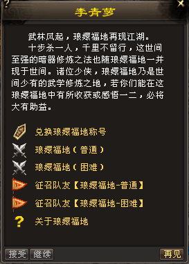 90级及以上等级角色组队3人以上,前往大理(293,92)李青萝处,由队长点击选项“创建琅嬛福地(普通)”或“创建琅 嬛福地(困难)”并进入副本。副本分4个BOSS关卡,每打败一个关卡的BOSS后可前往击杀下一关卡的BOSS,关卡BOSS依次为:李秋水(3个战斗 阶段)→天山童姥(2个战斗阶段)→无崖子(3个战斗阶段)→虚竹(2个战斗阶段)。