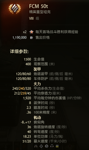 首先一台金币车最重要的就是他的火力,毕竟是靠输出来打收益的。50T拥有法国传家的一门90炮,没错,90炮,就是1390的那个90。一台 HT用90炮怎么能称为优点呢?其实虽然口径小,但是由于这个原因,换来的其实是火控,射速。50T的纸面缩圈时间是2.3秒,百米精度。36,射速8发 /分钟。那么按照纸面数据来讲,这门90炮的缩圈时间和精度已经算非常好了,每分钟纸面输出量为1920,那么在极限射速下,50T可以达到5.93秒一 发,也就是每分钟打出10发炮弹,2400的输出量。这在同级HT中算顶尖的DPM了。配合优良的火控,而且拥有银币蛋212的穿深,几乎可以击穿他分房 内的所有车的装甲。这就是他最大的优点。