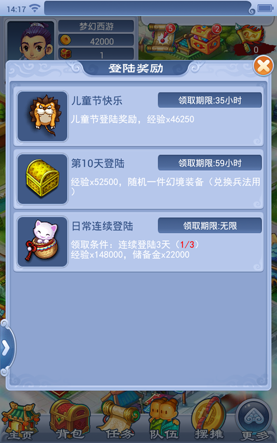 活动期间,玩家(角色等级≥30级,队伍人数≥3人)可在位于长安城(236,115)的童真使者处选择选项“六一同欢畅(环任务)”领取任务,完成任务后可以获得丰厚的经验、金钱和物品奖励。