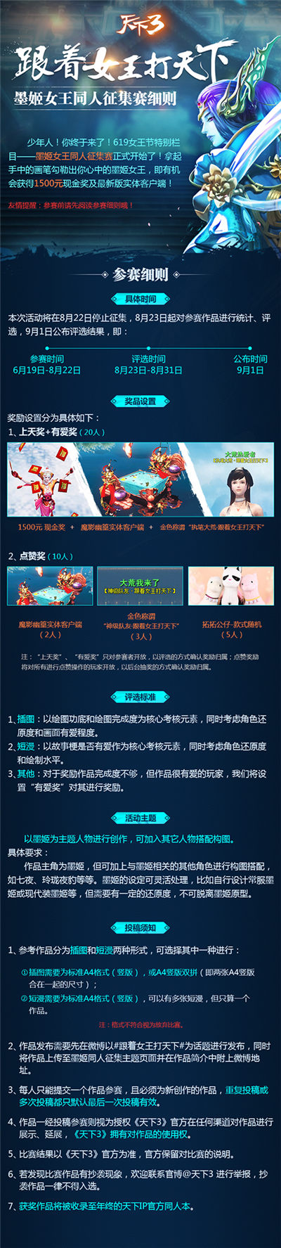 另外,墨姬女王同人征集赛正式开始了!拿起手中的画笔勾勒出你心中的墨姬女王,即有机会获得1500元现金奖及最新版实体客户端,获奖作品将被收录至年终的天下IP官方同人本!