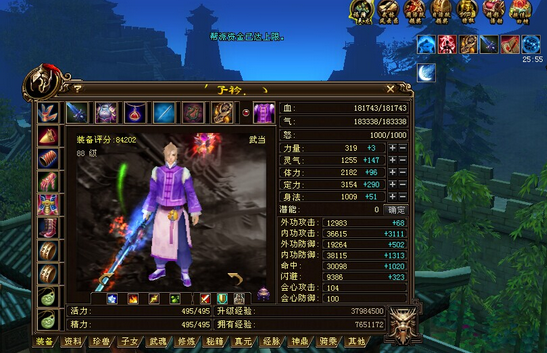 卡79的时候已经是小号中的大BOSS级存在了,我经常带一个勇猛裸资2700+带高净化技能的英招。在比武切磋的时候我让对方打我,我不出手只用英招 打,结果是我没死,对方已经被我的英招打死了,就这样我还赢过一个4万多评分的逍遥和武当。(PS:英招穿75的勇猛套,一个猛击下8000多血,这伤害 对于当时的普遍贫血的小号来说非常致命的,而且英招全身法点命中很高,猛击经常击中)。我深深的感受到了小号气武当的强大和无敌。当时和我同评分吃卡的小 号也就14万到16万血左右,而我当时血气量高达27万,少林也比不过我。而因为没对手很寂寞的缘故,也可能是我因为花了1000多人民币合了一个不绑定 的龙纹洗得不够完美没舍得穿上,结果因为天外改版了龙纹价格由当时的45元宝变成了8元宝一个令我很无奈。不管是什么缘故我就点升级了。升到了88级。 (附属性图:这是令牌刚刚出现时我的面板图,由于刚从79升到88没多久,加上我也不常上线,精通什么的基本等于无,但那时候同级别评分的卡级号也就20 来万血,15到16万评分的卡级号血量都没我血气量多。卡88级最高面板图为32万血20万气,11万评分)