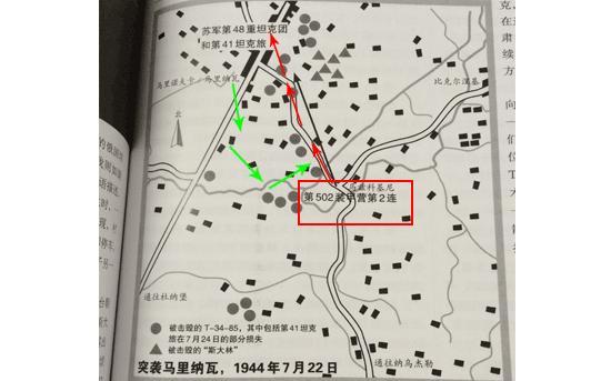 红框与红色线路为502重型坦克营伏击与进攻的区域,绿色为苏军反击方向: