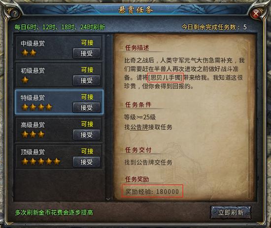 如上述截图示例,玩家随机得到了5个悬赏任务,其中一个特级悬赏要求玩家上交一件思贝儿手镯,玩家将因此获得高额经验值奖励。