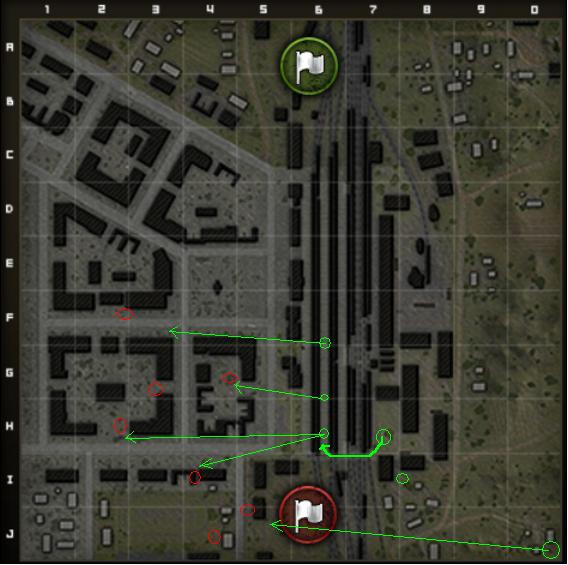 因此,这需要一个装甲硬或者头硬的车,或者射速快的车卡进6线的铁道,利用火车厢的缝隙来回的射击城市。这样有人在铁道的时候,敌人就不得不分心看铁道,根本没法办法组织对8线进行反击。敌人就只能龟缩在F线以下,6线以左的小范围内。