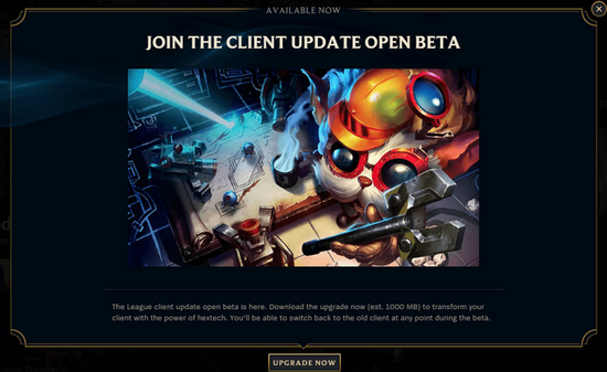 想要升级你的客户端的话,只要在季前赛期间的某个时刻选择参与你当前页面上的弹窗即可。在公测期间任意时刻,你都可以手动恢复老版本的客户端页面,并且当公测结束的时候,每一位玩家都将自动升级到新的客户端。公测结束仅仅只是一个开始,客户端——就像游戏本身一样——会一直继续发展下去。