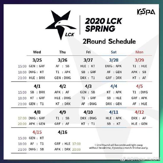 LCK春季赛第二轮的赛程安排为每周打5天,每天最多有3场比赛,进行3场比赛时从北京时间下午14:00开始,进行2场比赛则从北京时间下午16:00开始,当前一场比赛提前结束时,后一场比赛顺延进行,无需等待到固定开始时间,线上赛的赛制均为BO3。