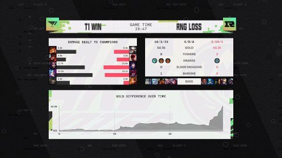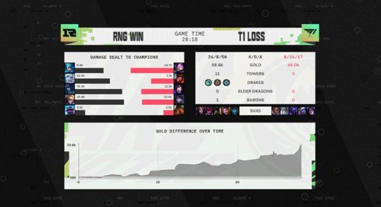 第五局:开局2分钟,Keria悠米走位不慎被RNG下路双人组击杀,Ming洛拿到一血。3分钟,RNG Wei盲僧来到中路配合Xiaohu冰女击杀Faker狐狸,但T1 Oner猴子也及时赶到击杀Xiaohu冰女。前期4分钟,RNG中野支援上路合力击杀Zeus杰斯。5分钟,RNG Xiaohu冰女卡6级先手控制Faker狐狸,配合Wei盲僧将其击杀,并转头rush掉小龙。后续RNG频繁找机会击杀T1多人,不断扩大优势。中期22分钟龙魂团,GALA小炮三杀击溃T1,RNG拿到土龙魂,随后转头拿下大龙Buff。25分钟,RNG携大龙Buff中路推进,伤害碾压击溃T1,顺势一波推平T1基地,赢下决胜局。