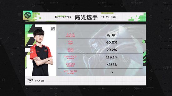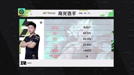 第三局:3分钟RNG入侵野区拿下一血;6分钟RNG中野越塔击杀对方中单;7分钟RNG下路完成线杀;9分钟RNG击杀对方四人,随后控下先锋和小龙;18分钟团战打出1换2;23分钟团战打出2换5,拿下听牌龙;24分半RNG拿下大龙;28分钟RNG一波高地推进拿下比赛!本场比赛MVP给到Wei佛耶戈!