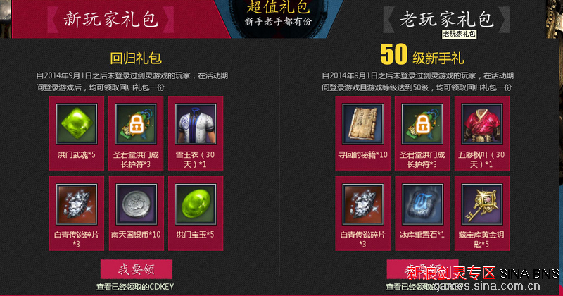 自2014年9月1日之后未登录过剑灵游戏的玩家,在活动期间登录游戏且游戏等级达到50级,均可领取回归礼包一份