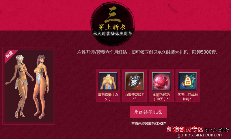 在指定页面一次性开通6个月红钻,即可领取剑灵永久夏日海滩时装礼包,限领5000套,单Q限领一次,多次开通只能获得一次领取机会。