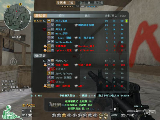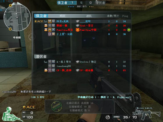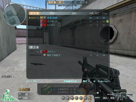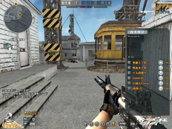 大家看着左上方。一个小雷达,看见了吧。它的作用可是很大的。用它你可以看到你所在的房间里队友发生的一切。即使不熟悉图的时候根据这个雷达你也不会迷路。配合右上方的击杀信息你可以确定哪儿有敌人,哪儿的队友守点守得固若金汤。有时候你可以根据击杀信息跟雷达的配合,再根据现实地形来阴点。