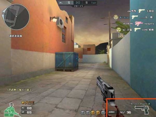 弹仓控制的第一个技巧就是要学会压一到两发子弹,尤其是一些使用子弹较多的手枪,比如沙漠之鹰-A、S、暗杀者、M66翔龙等等,当你的对手打完子弹的时候可能你还会剩下2-4发左右的子弹,此时你的对手一定会想尽办法躲避你的子弹来支撑到子弹换号,如果此时你也泼洒完子弹,除非你能克服他躲避所带来的命中障碍,打死他,否则当你对手换完子弹的时候,对方已经换好子弹,这是你就处于完全被动的状态。(图中我的对手速射打完了7发子弹,躲入蓝色箱子后换子弹,此时我压住手枪中4发子弹未开枪)。