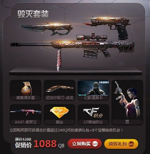 毁灭修罗套装(Barrett-毁灭+沙鹰-修罗),原价1288Q币,优惠价1088Q币。可以使用88Q币英雄武器代金券。
