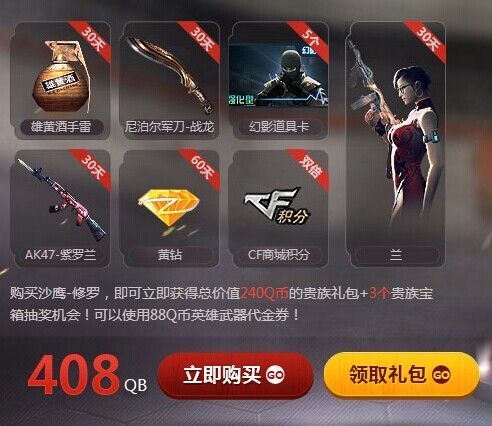3.买沙鹰-修罗、黑骑士修罗套装、毁灭修罗套装可以获赠贵族礼包((内有雄黄酒手雷(30天)、兰(30天)、幻影道具卡(5个)、 尼泊尔军刀-战龙(30天)、AK47-紫罗兰(30天)、黄钻(60天)、双倍CF商城积分);