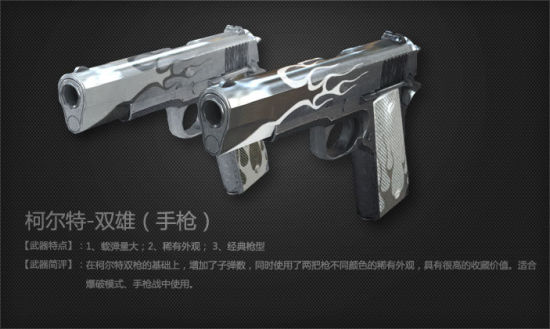 穿越火线柯尔特双雄手枪介绍 2014-10-20 16:43 新浪游戏 0 柯尔特-双雄(手枪) 柯尔特双枪家族的新成员,两把武器使用不同的颜色,外观新颖,极具收藏价值。 枪重: 2.54 kg(单枪) 全长: 249 mm(单枪) 弹匣容量: 26/52(双枪) 有效射程:150 m 射速: 350 RPM(单枪)柯尔特-双雄(手枪)