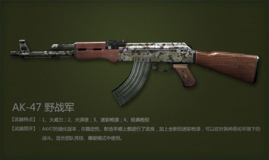 描述:AK-47的强化版本,专为特殊的恶劣环境下战斗而设计,使用了中国制式迷彩图案。弹匣容量扩充到35发,稳定性和战斗力都得到了提升。