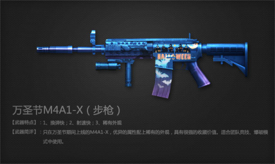 穿越火线万圣节M4A1-X介绍 2014-10-20 16:28 新浪游戏 0 万圣节M4A1-X 弹匣容量:35/70 价格:(CF点)5500(30天) 描述:M4A1-X的万圣节限量版,在原枪的基础上增加了子弹数,提高了换弹速度,特殊的外表极具收藏价值。