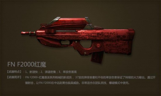 穿越火线FN F2000红魔步枪 2014-10-20 16:31 新浪游戏 0 FN F2000红魔 弹匣容量:37/111 价格:非卖品 描述:挑战模式奖励道具——红水晶箱、毁灭箱中有机会获得。高杀伤和高精度兼备的FN F2000的强化版本,用特殊材质制作了高调的“红魔”外观,提升了装弹数,战斗力大幅提高。