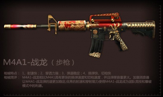描述:在M4A1的基础上加装了消音器,增加了弹匣容量并加快了上弹速度,从而大幅提高了整体作战能力。使用特殊材料制作的黄金战龙外观,让整把枪散发着王者霸气!