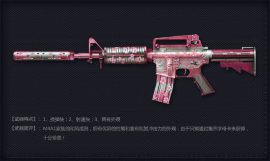 穿越火线CFM4A1-樱步枪介绍 2014-10-20 17:07 新浪游戏 0 M4A1-樱 弹匣容量:35/70 价格:集卡片奖励道具,非卖珍藏 描述:M4A1的限量加强版,拥有35发弹匣容量以及战术消音器,美丽的樱花为这把枪披上神秘的东方战袍。