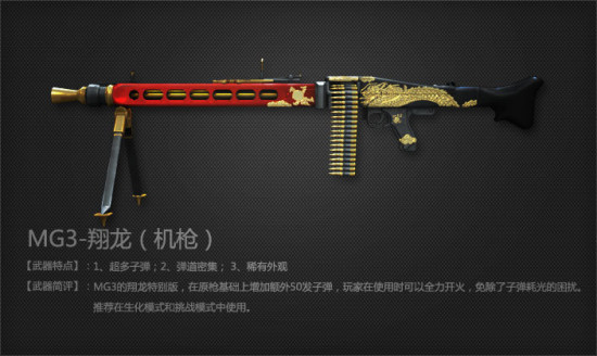 多功能机枪MG3增加了子弹数,武器使用特别材料制作,整个枪身被翔龙图案包围,显得格外尊贵,极具收藏价值。
