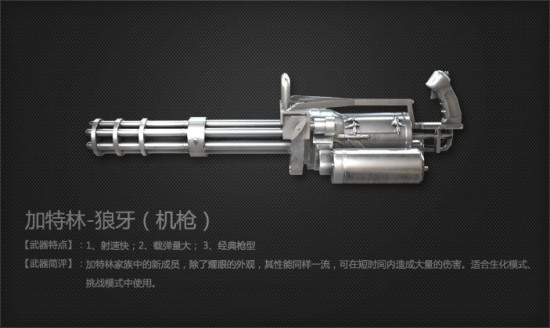 描述:加特林机关枪的加强型,闪亮的银色外观使整个枪犹如狼牙一般锋利,可对敌人造成成吨的伤害。