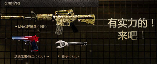 2014年12月最新CF精英军火库活动,免费领取M4A1-轻骑兵(7天)+沙漠之鹰-暗炎(7天)+扳手(7天)。